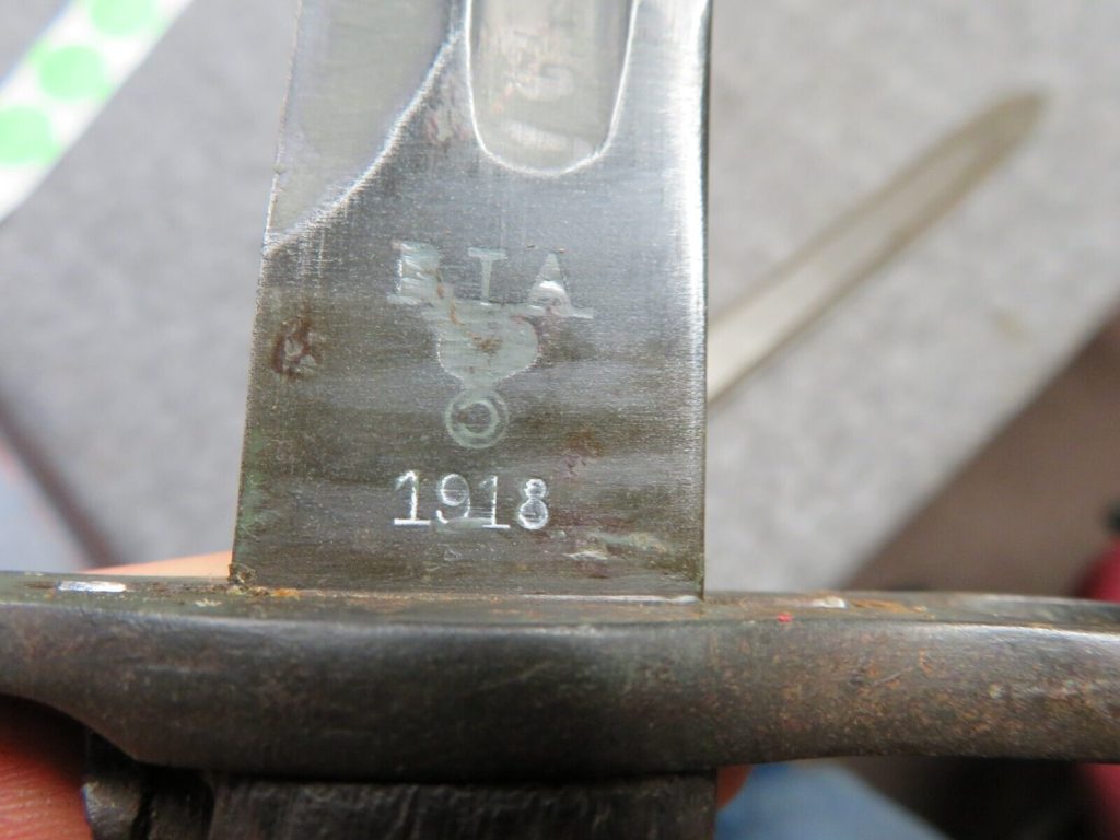 Good condition original WWI US Model 1905 bayonet that is marked “R.I.A.” on the left ricasso for Rock Island Arsenal and dated 1918 with a flaming bomb. Right ricasso is marked “US” with a serial number. Bayonet has original blue finish. Blade has some areas of green paint and brown scale. Wood grips have original finish and a good tight fit with some normal wear and handling marks. Lock button functions fine. Fitted in an original WWII US Navy MK 1 scabbard that has nice original green finish and no damage. A good example of a classic US M1905 bayonet.