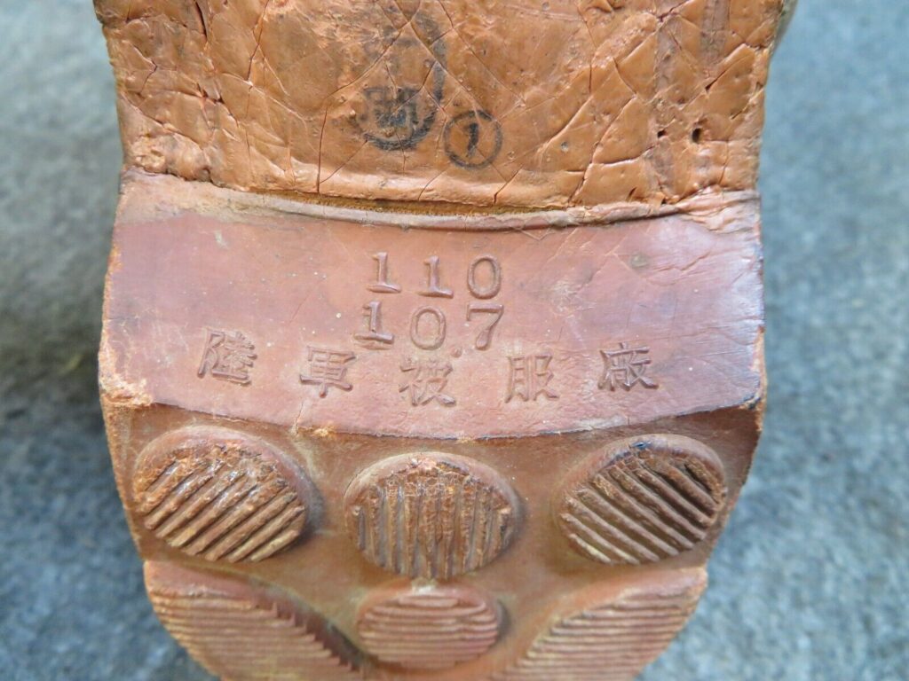 Good condition original pair of WWII Japanese army boots. Leather is pliable with some wear. The left side has a detached tongue. Rubber soles have nice kanji character markings. Marked for size 110. Hard to find WWII Japanese army boots.