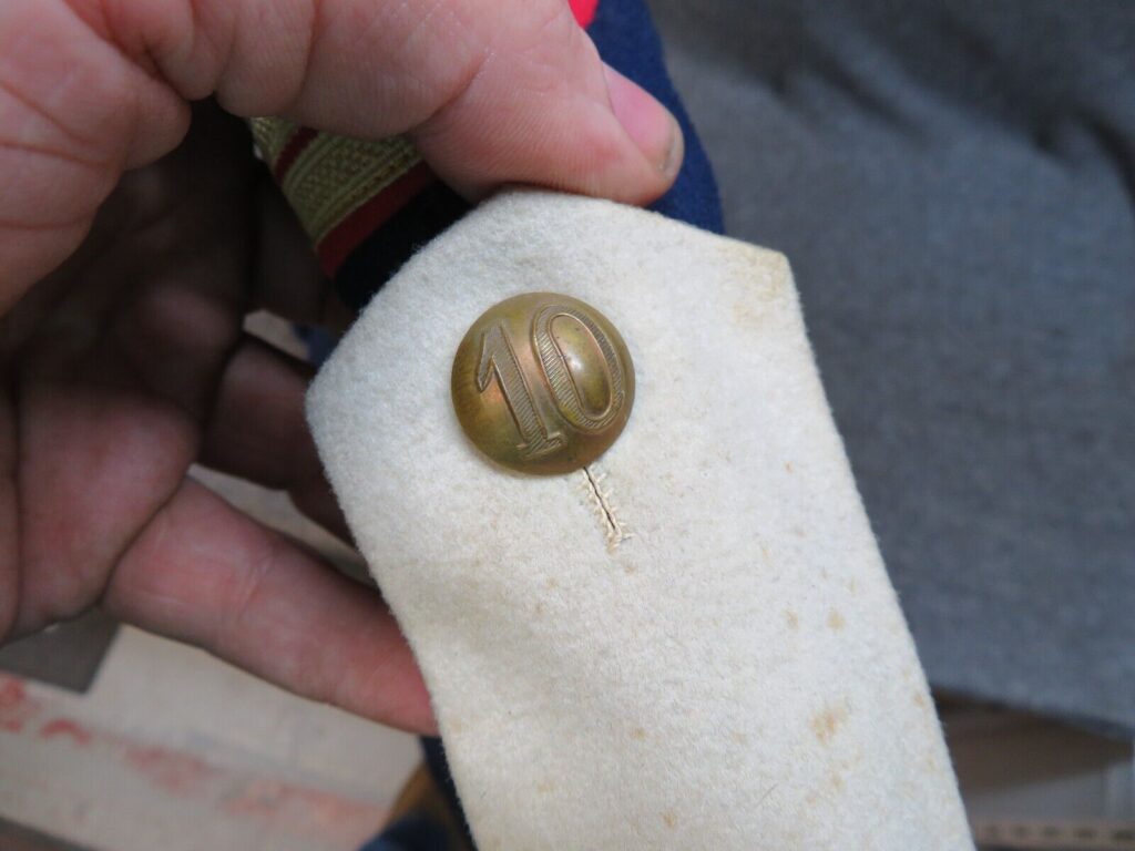 Very good condition original WWI Imperial German army Dunkelblau tunic. I believe this is for an NCO in the 1st Foot Guard Regiment. Shows some normal wear and staining. Complete with all original buttons, shoulder boards, Swedish cuffs, etc. Nice issue markings inside, dated 1918. Marked for Company 10, which matches the shoulder strap buttons. A hard to find pre war German tunic that will make a fine addition to a collection.