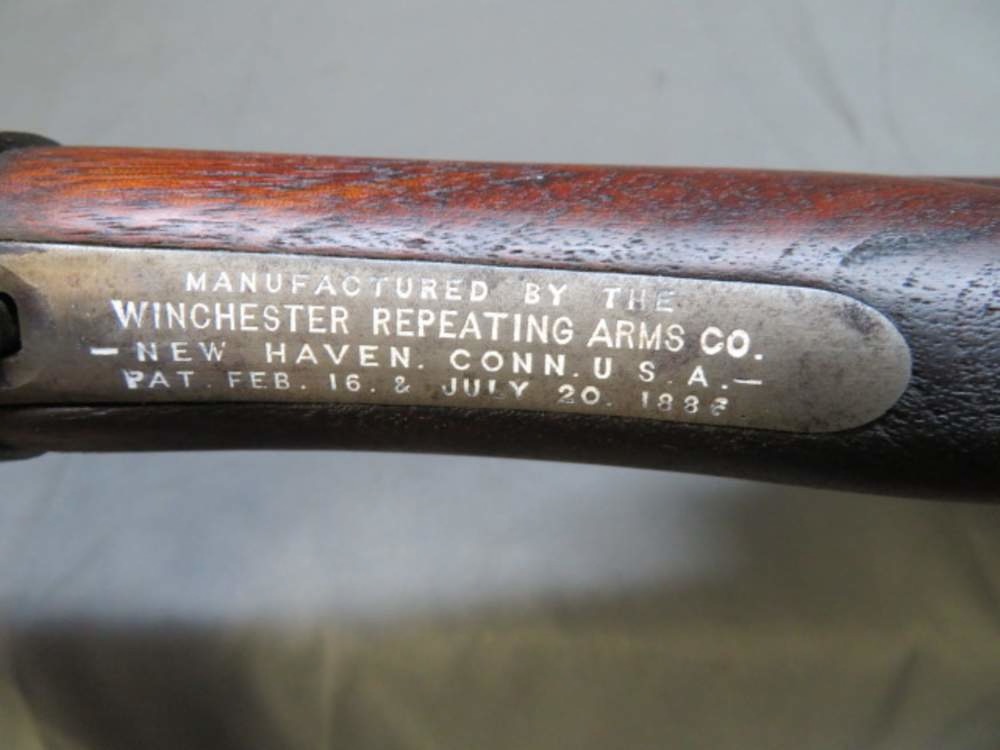 Good condition antique Winchester Model 1887 lever action 12 gauge shotgun that is serial number 43xxx, which dates it to manufacture in 1888. Mechanically functions fine. Metal finish is worn to brown and gray patinas. 30” barrel has a gray pitted bore. Stock has been sanded and refinished. Toe has a repaired chip. A good representative example of a classic Winchester Model 1887 lever action shotgun.