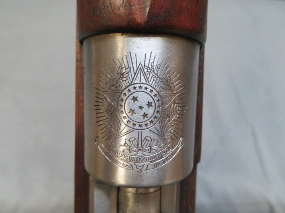 Excellent condition Brazilian Model 1908 Mauser Rifle in 7mm Mauser (7 x 57) caliber that has a sharp clear Brazilian national crest on the receiver ring and DWM Berlin manufacturer markings on the side rail. Rifle is NOT import marked and has all matching serial numbers. Receiver, bolt, and buttplate are original “in the white”. Remaining metal finish is excellent original blue. Bore has a few dark pitted spots, otherwise bright and excellent with strong rifling. Stock has original finish and crisp edges with a few normal handling marks. Right side buttstock has a sharp clear “B in star” cartouche. Underside of buttstock has a sharp clear matching serial number. Complete with an unnumbered cleaning rod. A really nice Brazilian M1908 Mauser Rifle with matching numbers.