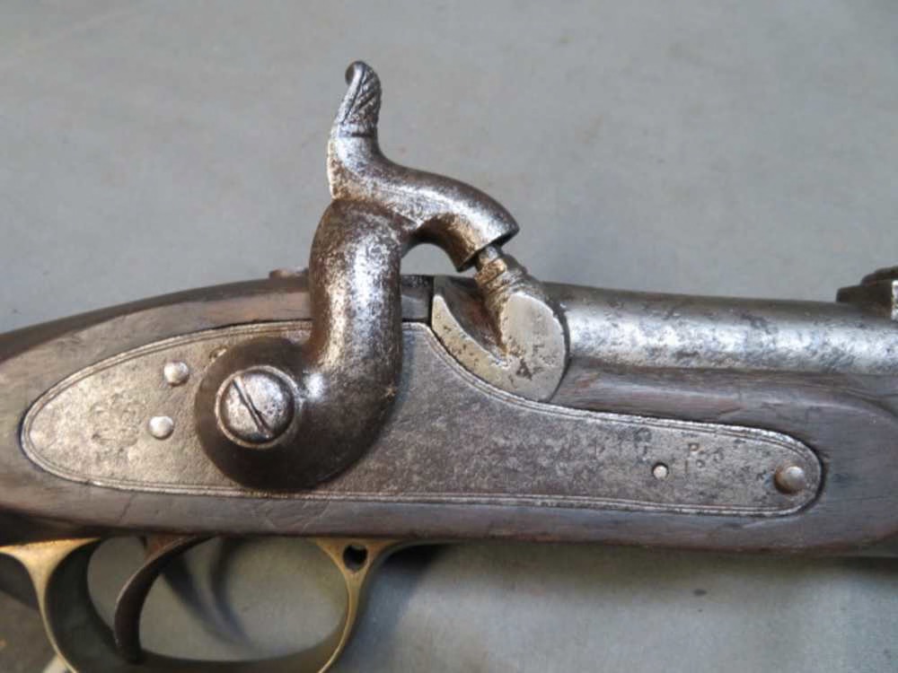 Good condition original antique Civil War era British Pattern 1853 Enfield Rifle Musket in .577 caliber. Lock is marked “1858 TOWER” and mechanically functions fine. Metal is “in the white” with some gray and brown patina and some pitting. Bore is poor, dark and pitted with average rifling. Stock has original finish and shows some handling marks. Left side of forend has some chips. Right side of heel has some chips. Right side buttstock has an 1863 dated roundel cartouche. Front band is an incorrect replacement, probably from a US Model 1861/1863 Springfield. Buttplate tang has a cancelled unit marking. Complete with a replaced ramrod. A good representative example of a classic Civil War British P53 Enfield Rifle Musket.