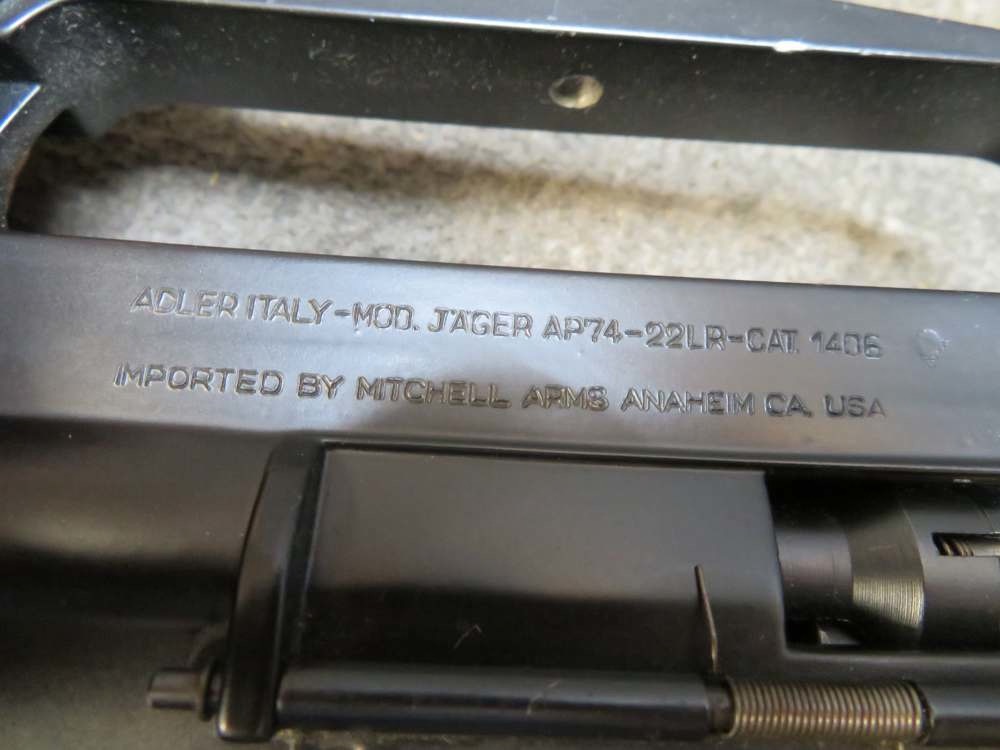Very good condition Adler Italy Armi Jager AP74 semi auto rifle in .22 LR caliber that is styled after the AR-15. Mechanically functions fine and comes with one 15-round magazine. Metal finish is original black and blue with some scattered dings, especially on the front sight. Bore is bright and excellent with strong rifling. Black plastic stock has some handling marks and scratches. A nice vintage .22 AR-15 style rifle that will make a fun shooter.