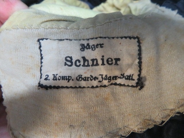 Very good condition original pre WWI Imperial German army tunic for the 2nd Company, Garde Jager Battalion. Clean with light wear. Nice original boards, tabs, and cuffs. Right sleeve has Kaiser’s prize for company’s combat marksmanship badge. Also has original marksmanship lanyard. Lining has nice original name tag. Complete with all original buttons. Hard to find WWI German Jager tunic that will make an excellent addition to a collection.