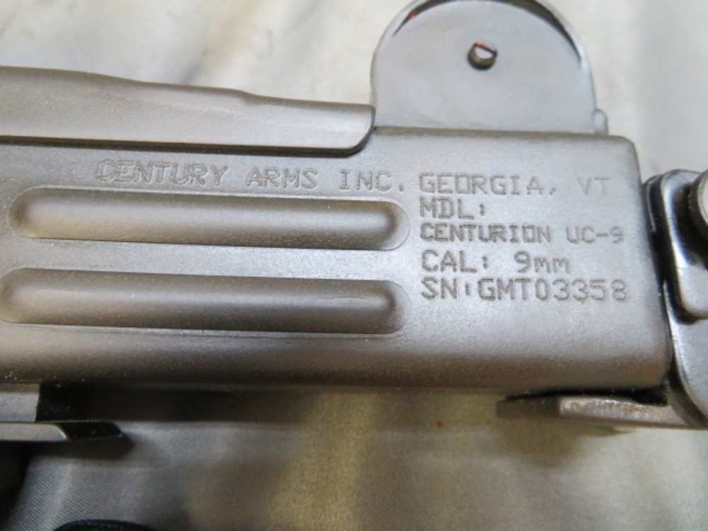 Excellent condition Century Arms Centurion UC-9 semi auto Uzi carbine in 9mm Luger (9 x 19) caliber. Mechanically functions fine and comes with one 25-round magazine. Metal finish is nice original parkerized. 16 ¼” barrel has a bright excellent bore with strong rifling. Black plastic forend and grips have no damage. Folding buttstock works fine. A nice semi auto Uzi carbine that will make a fun shooter!