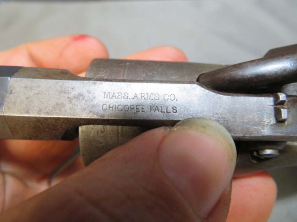 Good condition antique Massachusetts Arms Co. Wesson & Leavitt belt model revolver in .31 caliber percussion. Mechanically functions fine and tight. Nice manufacturer markings on lock and top strap. Metal has mostly brown and gray patina. Brass grip straps have nice original silver finish. Cylinder, frame, and lock have nice original engraving. 4 ½” barrel has a good bore with strong rifling and a little pitting. Wood grips have original finish and show some normal handling marks and varnish loss. Left side has a tiny chip at the toe. A hard to find revolver, with only 1,000 produced circa 1850-51, that will make a fine addition to a collection.