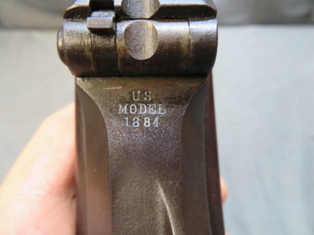 Very good condition antique US Model 1888 Trapdoor Springfield Rifle in .45-70 caliber. Lock is marked “U.S. / SPRINGFIELD” with the American eagle. Breech block is correctly marked “MODEL 1884”. Barrel has “VP” and eagle head proof marks. Mechanically functions fine. Rifle is unit marked “13 N.Y.” in the right side buttstock. The 13thNew York Infantry was one of 12 New York regiments federalized for service during the Spanish American War. Metal finish is original blue turning an attractive plum brown patina with some light oxidation throughout. Bore is bright and excellent with strong rifling. Stock has nice original finish and crisp edges with some normal handling marks. Left side of wrist has a sharp clear 1892 dated “SWP” inspector cartouche. Underside of wrist has a sharp clear “circle P” cartouche. Complete with correct original ramrod bayonet. Bayonet lock system works fine. A nice US Model 1888 Trapdoor Springfield Rifle with an uncommon New York unit marking.