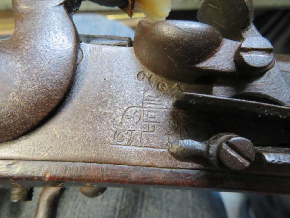 Good condition original antique English .58 caliber flintlock trade musket. Lock has the “elephant & castle” marking and is also marked “WARRANTED”. Breech has “30” gauge marking and two British proof marks. Metal has nice even plum brown patina with some light pitting throughout. 51” barrel has a slight bend, as is common with these poor quality trade guns. Smooth bore is dark and pitted. Stock has original finish and shows some normal handling marks. Complete with correct original bone-tipped ramrod. An interesting English flintlock trade musket that will make a fine addition to a collection.