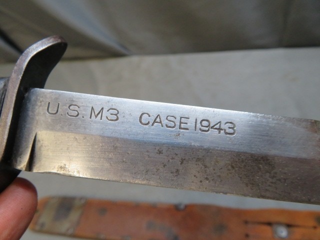 Good condition original WWII US Army M3 fighting knife that is maker marked “CASE” on the right side of the blade and dated 1943 along with the model designation. Pommel has a flaming bomb proof mark. Blade has been polished bright and has been sharpened. Guard is slightly bent back. Stacked leather washer grip shows some wear. Fitted in correct M6 leather sheath that is marked “U.S. M6/L&C/1943/FJA”. Leather is soft and supple with some normal wear and crazing, stitching and rivets are tight. Complete with handle straps that have working snap. A good original early M3 knife for your collection.