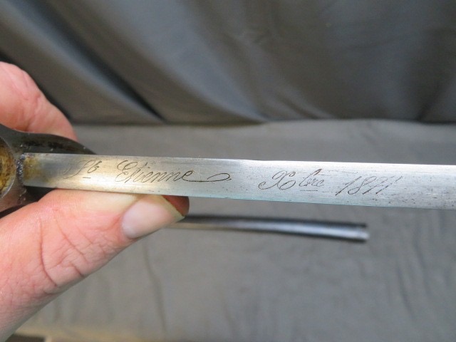 Excellent condition original French Mle 1866 Chassepot bayonet that is complete with matching numbered scabbard. Bayonet has St. Etienne Arsenal markings on the blade spine and dated December 1871. Blade has beautiful original bright finish and was never sharpened. Guard has nice original bright finish. Brass grip has nice mellow patina. Lock button and leaf spring function fine. Matching numbered steel scabbard has nice original blue finish and no dents. A beautiful Chassepot bayonet with matching numbers.