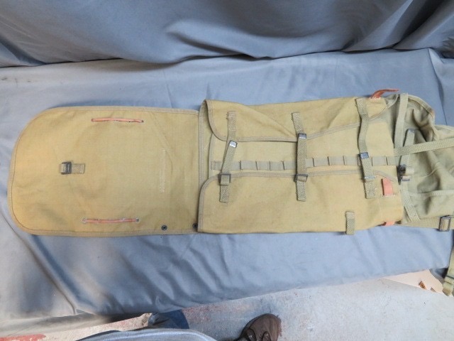 Excellent condition, original pre-World War I US Model 1910 haversack. Rare early pattern featuring a lace-on meat can pouch design. Clean overall with very little wear. And just a few minor rust stains. Sharp, clear “U.S.” stamp. Maker marked “ROCK ISLAND ARSENAL” and dated 1911. Complete with original early pattern meatcan pouch and a WWII pack tail that is marked “BOYT -41-“. Nice set for your collection.