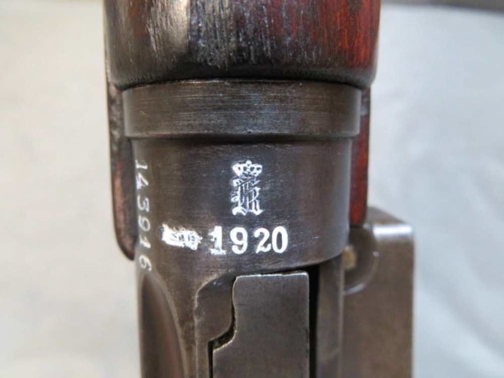 Good condition Norwegian Model 1894 Krag Jorgensen Rifle in 6.5 x 55mm caliber that has the Kongsberg Arsenal “crown K” marking on the receiver ring and dated 1920. Rifle is NOT import marked and has all matching serial numbers except the bolt. Metal finish is original blue showing some normal wear. The muzzle of the barrel has been cut back, and the bayonet lug sleeve extends past the barrel now. Bore is dark with average rifling that shows some wear. Stock has original finish and shows some handling marks. Forend tip has a repair. Rear of handguard has a hairline crack. Left side of stock has a matching serial number below the receiver. Complete with a replaced cleaning rod. A hard to find Norwegian M1894 Krag Jorgensen Rifle that will make a fine addition to a collection.