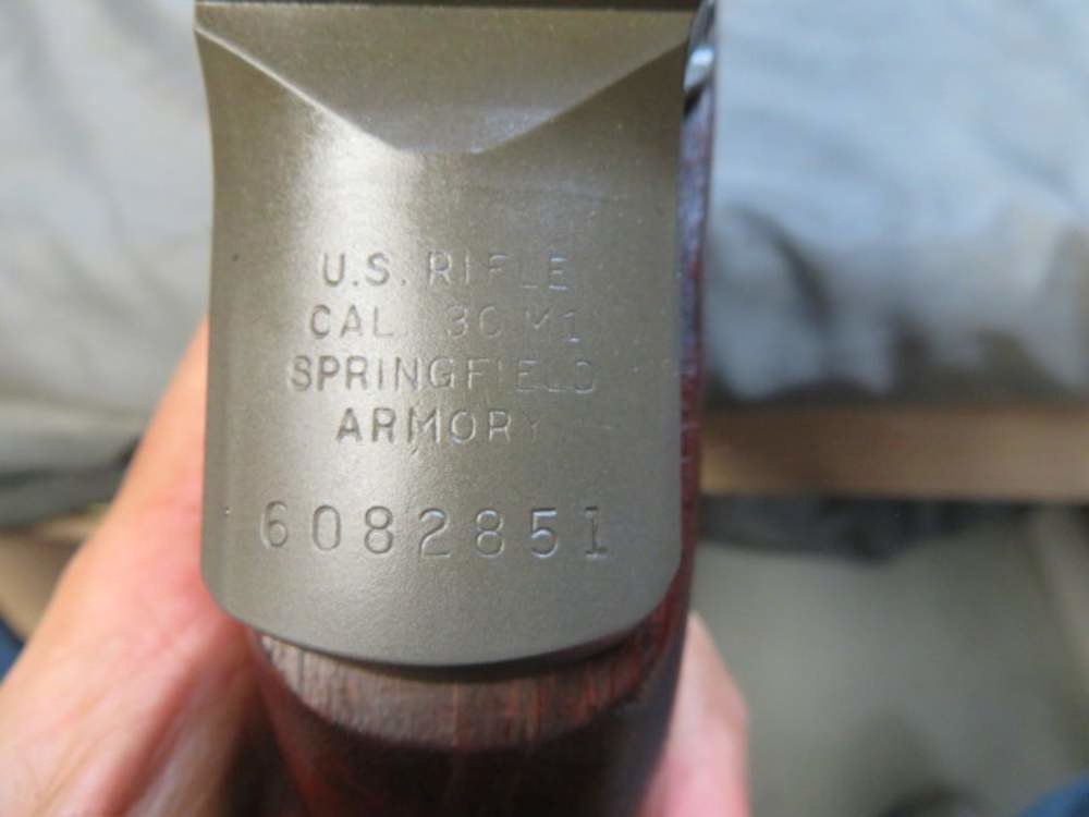 Fine condition US military M1 Garand semi auto rifle in .30-06 caliber that was manufactured by Springfield Armory, as marked on the receiver. Receiver is serial number 6082xxx, which dates it to manufacture in 1956. Rifle is NOT import marked and has all Springfield Armory parts. Barrel is dated “5-56” for May 1956. This is a very late production gun, almost at the end of all manufacture. Metal finish is original gray parkerized showing a little normal wear. Bore has a very slight pitted ring, otherwise bright and excellent with strong rifling. Stock has original finish and shows some normal handling marks. Left side of stock has a DOD eagle cartouche below the rear of the receiver. Underside of buttstock has a “circle P” cartouche. A nice, very late Springfield M1 Garand!