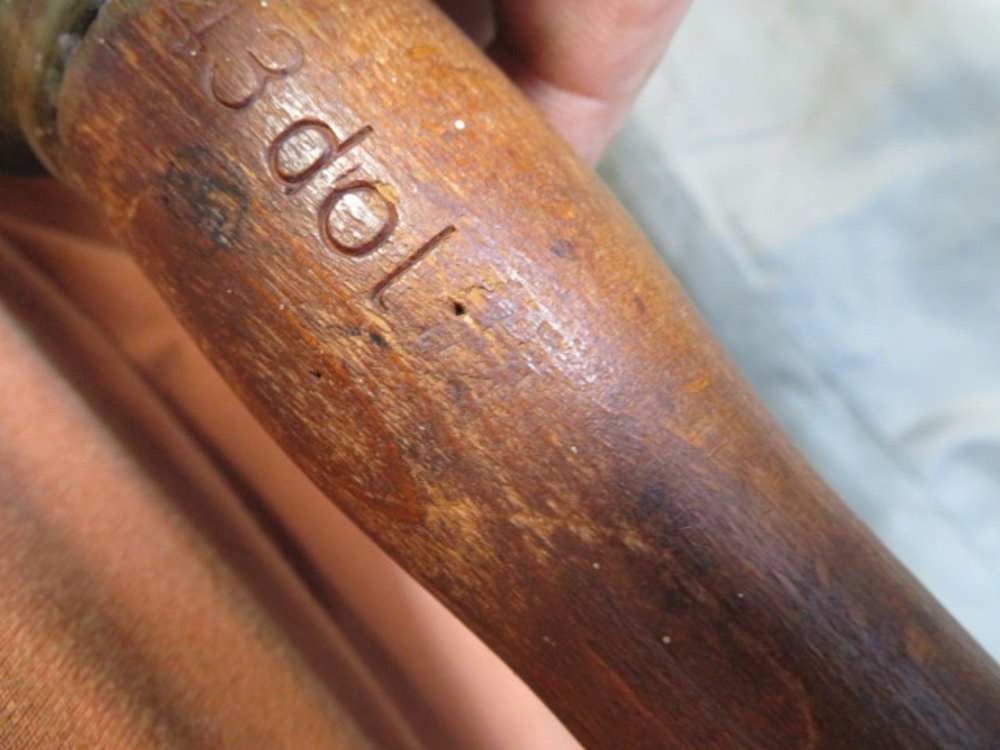 Very good condition original WWII German M1924 stick grenade that is a combat issue example, NOT a trainer. Inert, safe and legal to own. Head has nice original green paint and is marked “43fcc” for manufacture by Hermann Nier in 1943. Wooden handle has original finish and shows some scratches. Marked with a Waffenamt and code “43dol” for manufacture by Heinrich Dominghaus in 1943. I cannot unthread the cap to check if the bead is there. Nice, classic WWII German stick grenade.