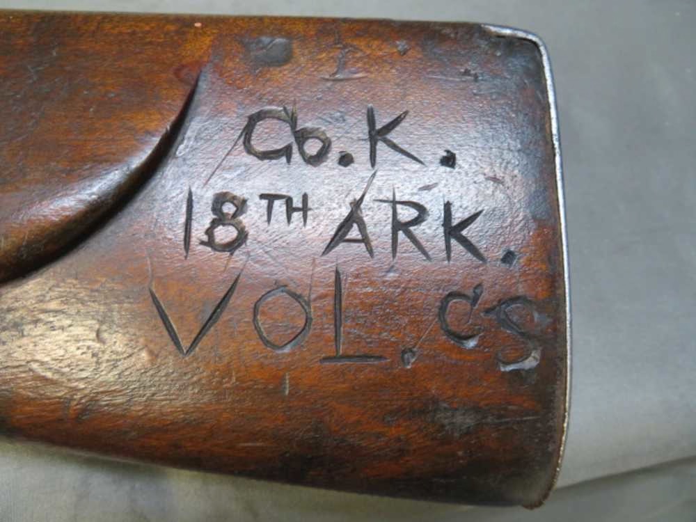 Good condition original antique Civil War import Austrian Model 1851 cavalry carbine in .71 percussion caliber. Mechanically functions fine and tight, and was converted from pill lock to percussion using the Piedmont Alteration. Metal is “in the white” with some gray and brown patina and some pitting. Bore is poor, dark and pitted with average rifling. Stock has original finish and shows some normal handling marks. Left side of stock has a crack by the breech. Left side buttstock has spurious carved unit markings for Company K, 18th Arkansas Volunteers, which was a Confederate unit. A scarce and desirable Civil War Austrian carbine that will make a fine addition to a collection.