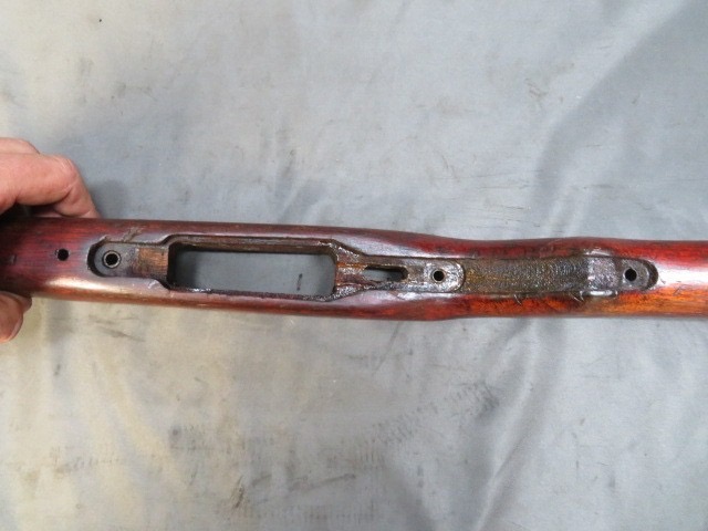 Very good condition original WWII Japanese Type 99 Arisaka rifle stock set. Full length and complete with both bands, all band screws, sling swivels, square cleaning rod release, nosecap and buttplate. Wood has original finish and shows some normal handling marks. Left side of handguard has a chip. Hard to find T-99 stock on the loose.