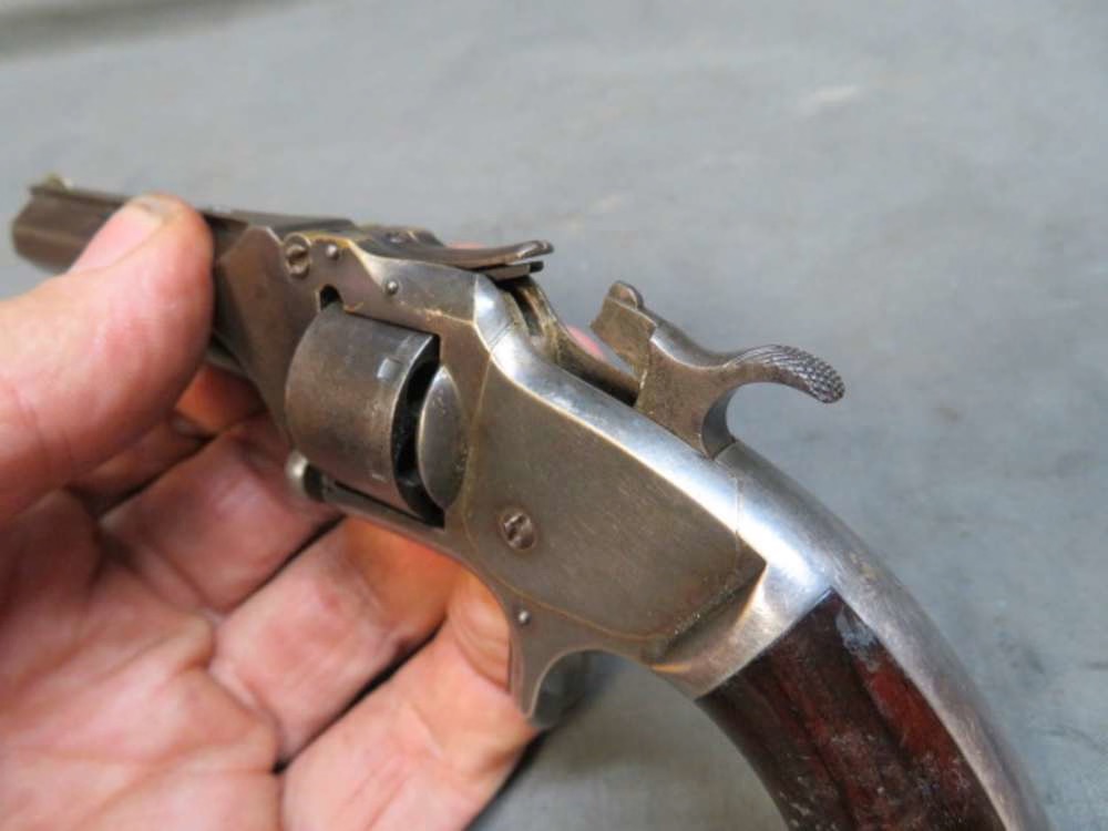 Excellent condition original antique Smith & Wesson Model No. 1 Second Issue Revolver in .22 rimfire caliber. Mechanically functions fine and tight. Frame has nice original silver finish. The remaining metal finish is original blue showing some wear and some light pitting. 3 3/16” barrel has a good bright bore with strong rifling and a little pitting. Wood grips have original finish and a good tight fit with some normal handling marks. Gun has all matching numbers and comes with the rare original Gutta Percha case that is in good condition with nice detail and a few cracks and chips. Also includes 53 rounds of original .22 rimfire ammo. A hard to find early cased Smith & Wesson .22 revolver that will make a fine addition to a collection.