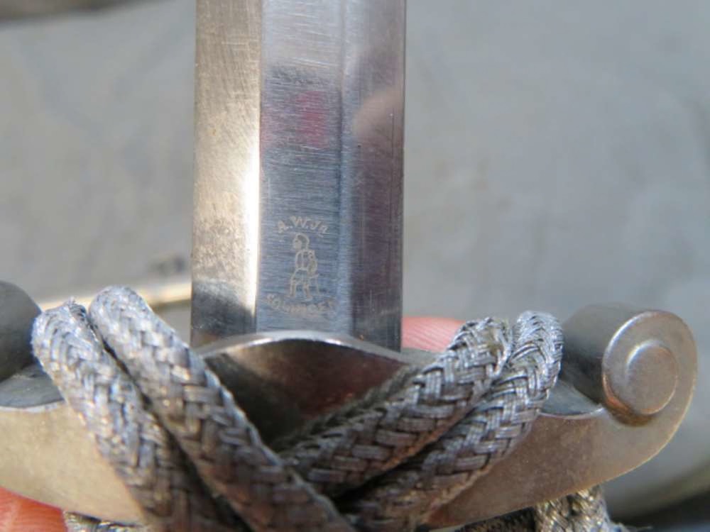 Very good condition original WWII German army officer dress dagger that has Anton Wingen Jr. manufacturer markings on the blade. Blade has a nice original bright finish. Still has the original leather washer at the base. Hilt fittings have a nice original silver finish. The yellow-orange grip has no damage. Complete with the correct original portepee (knot) that shows some normal wear. Fitted in the correct original steel scabbard that has a nice original silver finish and no dents. A nice WWII German army officer dagger for your collection!