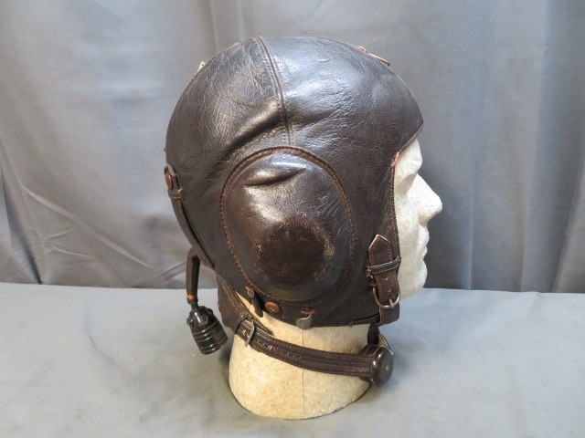 Excellent condition original WWII German Luftwaffe LKpW101 winter flight helmet. Leather is soft and supple with some normal wear—nice shearling lining and tag. Complete with original Ln26602 headphones and Ln256779-3 throat microphone. These are not tested for functionality. The right headphone has damage to the plastic. Nice Luftwaffe flying helmet set! Comes with a Styrofoam display head.