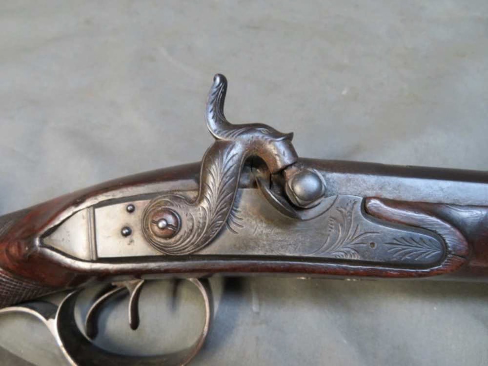Very good condition original antique 20 gauge percussion muzzleloading double-barreled shotgun that was originally made as a flintlock and later converted to percussion. Locks are marked “B. Cooper N. York”. Spanish-made barrels are marked “JUAN SANTOS” and have gold-inlaid markings. Both locks function fine. Metal finish is nice, original brown. 34” barrels have dark, pitted, smooth bores. The stock has its original finish and shows some normal handling marks. Both sides of the forend have a few chips on the edge. The wrist has nice original checkering. The stock has silver mountings, including an inlaid shield on top of the wrist with an engraved monogram. Complete with a brass-tipped wooden ramrod. A nice, rare antique American double-barreled shotgun that will make a fine addition to a collection!
