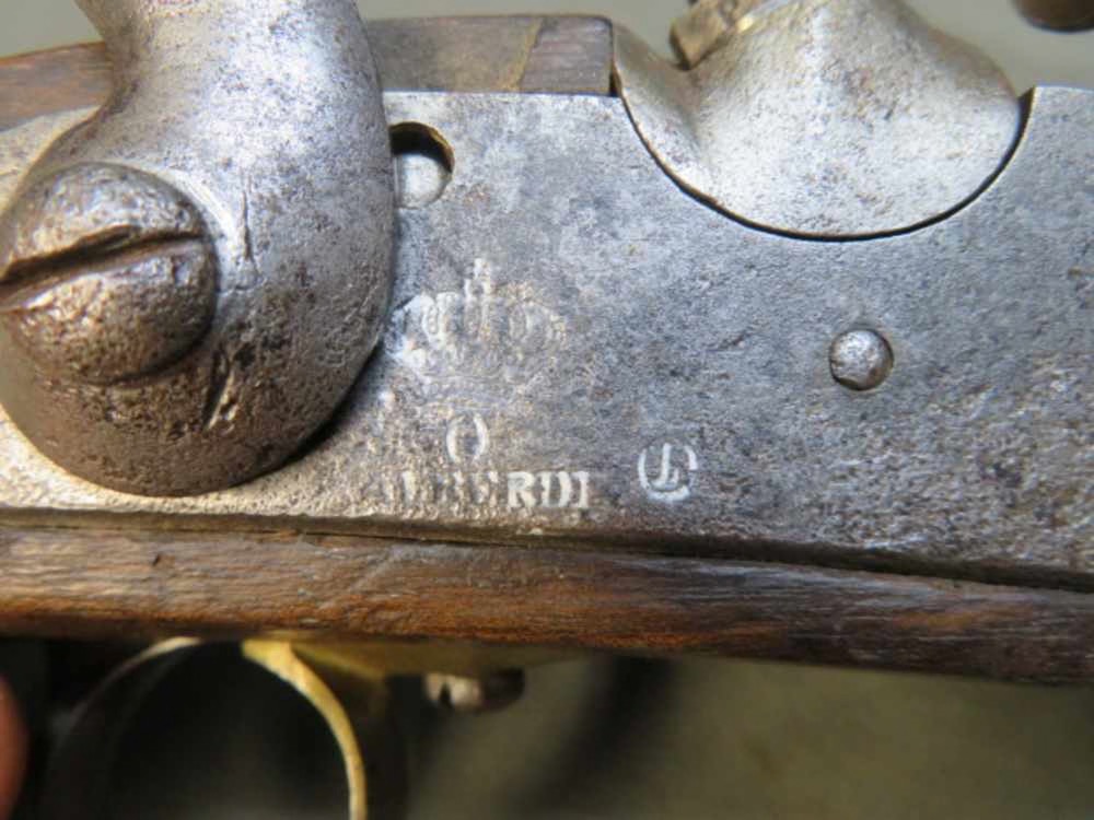 Good condition original antique Spanish Model 1852 cavalry & Guardia Civil percussion muzzleloading pistol in .70 caliber. Mechanically functions fine. Metal is in the white with some gray and brown patina and some pitting. 7 ¾” barrel has a good smooth bore with some pitting. Stock has original finish and shows some normal handling marks. Left side is marked “ECH”. Complete with original captive ramrod. A hard to find pistol that will make a fine addition to a collection.