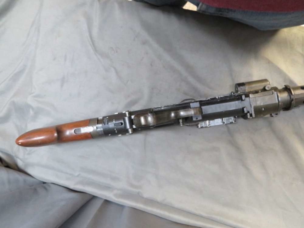 Very good condition WWII German MG 34 machine gun that is a display gun assembled using a solid, inert dummy metal receiver. Non-gun, no FFL required. Otherwise original parts including live barrel. Marked “dot” for manufacture at BRNO in Czechoslovakia and dated 1945. Has Israeli markings. Metal finish is arsenal reblued and parkerized. Bore is good, a little dark, with strong rifling. Stock has been refinished. Complete with a postwar Czech bipod.