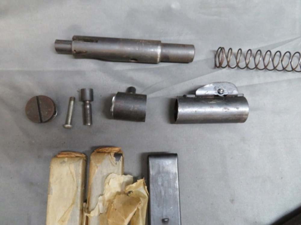 Very good condition original Ingram Model 6 submachine gun parts kit. .45 ACP caliber. Includes stock set, cut receiver pieces, live barrel, and 3 magazines. Nice original wood and metal finishes. Bright excellent bore with strong rifling. Hard to find parts kit in great condition!