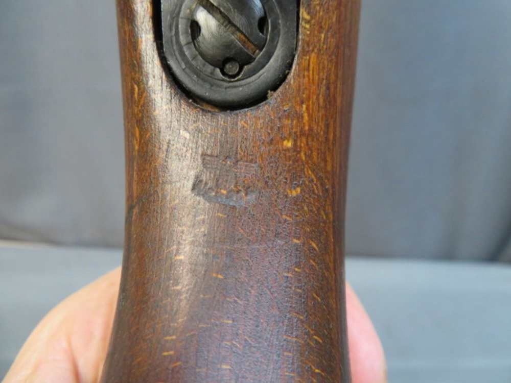 Fine condition WWII German G43 semi auto rifle in 8mm Mauser (7.92 x 57) caliber that is marked “duv 44” on the receiver side rail for manufacture by Berlin Lubecker in 1944. Rifle is NOT import marked and has all matching serial numbers. Metal finish is nice original blue showing a little normal wear. Bore is fine and bright with strong rifling. Stock has original finish and shows some normal handling marks and scratches. Right side buttstock and undersides of wrist and forend have Waffenamts. Underside of buttstock also has a matching serial number. Complete with correct original cleaning rod, front sight hood, muzzle thread protector, and action dustcover. A very nice G43 with matching numbers!