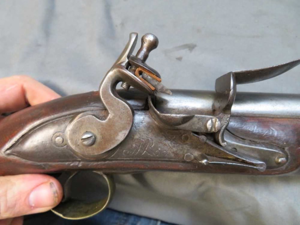 Good condition original antique Portuguese military flintlock pistol in .75 caliber. Lock is marked with the Portuguese royal cypher, “LISBON”, and a partially legible “18??” date. Unit marked on the triggerguard. Mechanically functions OK, but cock is a little loose. Lock has mixed plum brown, brown, and gray patinas. 9 ¼” barrel is “in the white” with some gray and brown patina and some light pitting. Smooth bore is dark and pitted. Stock has original finish and shows some normal handling marks. Forend has a few small chips by the pins. Complete with correct original ramrod. A hard to find Portuguese flintlock pistol that will make a fine addition to a collection.
