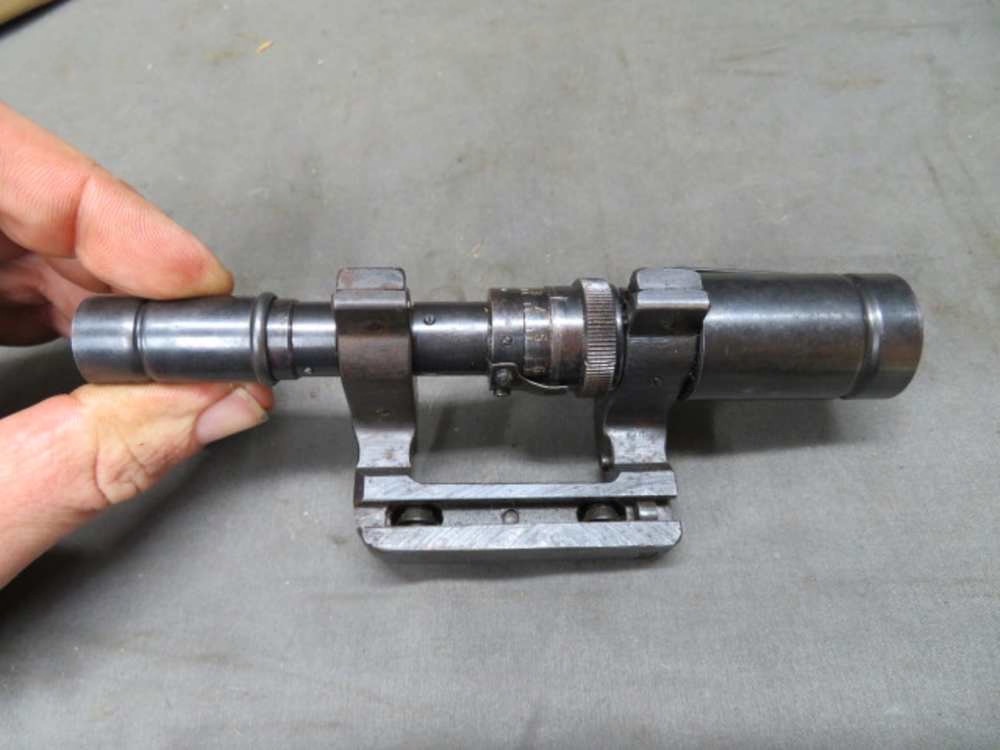 Very good condition original WWII German Zf 41 sniper scope for the 98k Mauser Rifle. Scope has nice original blue finish. Marked with code “cag” for manufacture by Swarovski in Tyrol, Austria. Nice clear optics with original reticle present. Scope is complete with both eye shades. Mount has nice original blue finish and has a working latch. Comes with original can that has nice original paint. Marked with code “jvb” and a Waffenamt. Case is complete. Nice Zf 41 scope.