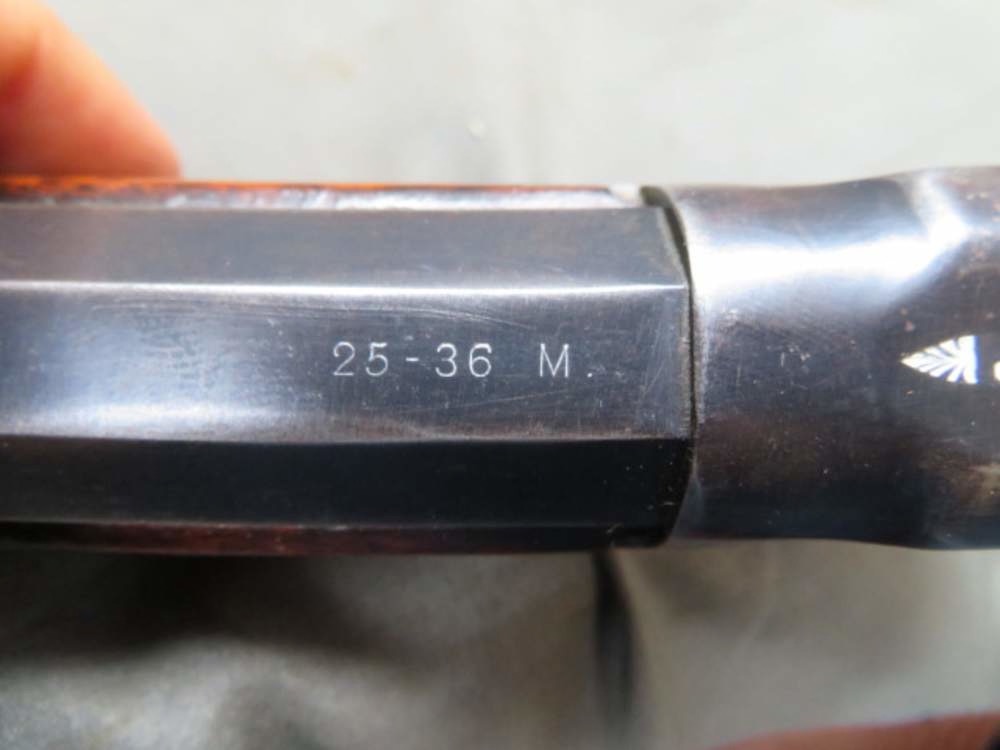 Very good condition, as refinished, Marlin Model 1893 lever action rifle in .26-36 Marlin caliber that is serial number 309xxx, which dates it to manufacture in 1904. Mechanically functions fine. Metal finish is nice reblue showing a little normal wear. 26” octagonal barrel has original sights. Bore is dark gray with good average rifling. Stock has been refinished and shows some normal handling marks. A nice early Marlin lever action rifle.