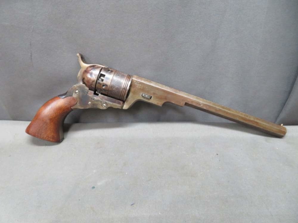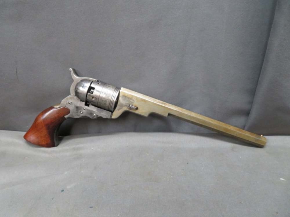 Good condition pair of reproduction Colt Texas Paterson Revolvers in .36 percussion caliber. Both are in good condition and have been “de-farbed” (artificially aged), with finish removed and artificial brown and gray patina created. 9” octagonal barrels have bright excellent bores with strong rifling. Wood grips have original finish and a good tight fit. Complete with case, powder charger, primer, combination loading tool/screwdriver, empty primer tin, and cleaning rod. Great set that will make a fine addition to a collection, a fantastic gift, or work well for a reenactor!