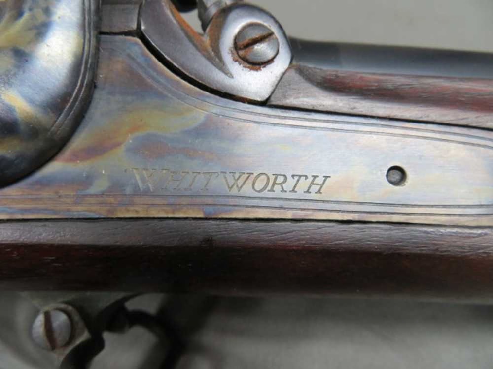 Excellent condition Parker Hale reproduction British Whitworth percussion muzzleloading rifle in .451 caliber. Mechanically functions fine and tight. Lock and hammer have vivid original case color finish. Remaining metal finish is excellent original blue. 36” barrel has original sights. There is a little rust at the breech. Bore is bright and excellent with strong rifling. Stock has original finish and shows a few normal handling marks. Wrist and forend have strong original checkering. Complete with correct original ramrod. A nice, high quality Parker Hale Whitworth Rifle that will make a fine addition to a collection, a fun shooter, and work well for a reenactor.
