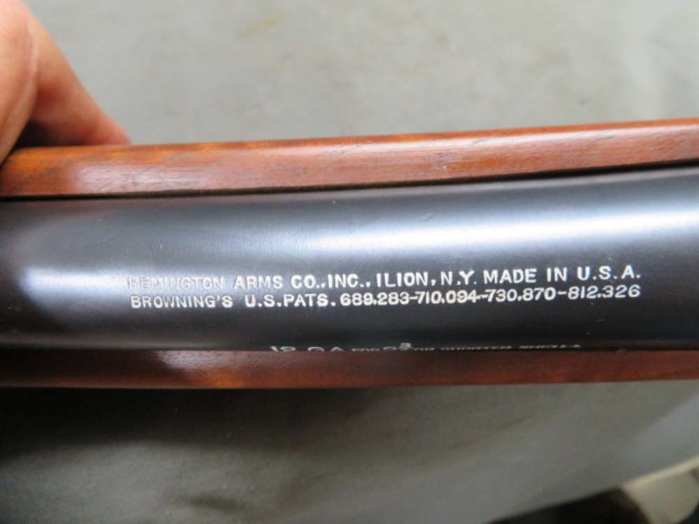 Very good condition WWII US military Remington Model 11 Sportsman “riot gun” semi auto 12 gauge shotgun. Has a “THE SPORTSMAN” marked bolt, but the Model 11 magazine. Serial number 705xxx, which is in the correct range for WWII US military guns. Marked “U.S.” and “flaming bomb” on the receiver and barrel. Barrel is marked with date code “OMM” for July 1943. Mechanically functions fine. Metal finish is excellent original blue. Bore is bright and excellent. Stock has nice even finish and was probably arsenal refinished. Left side buttstock has “FJA”, “RA”, and ordnance wheel cartouches. Underside of wrist is marked “P”. A nice US military Remington Model 11 Sportsman Riot Gun.