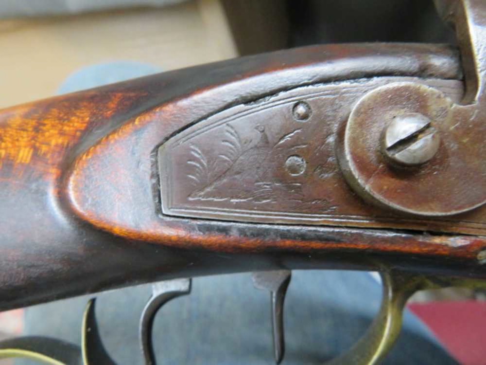 Very good condition original antique Pennsylvania style .36 caliber percussion muzzleloading rifle. Marked “P. Marker” on the barrel behind the rear sight and has a partially visible Dayton, Ohio marking on the barrel near the breech. Mechanically functions fine and features double set triggers. Metal has mostly brown and gray patina. 40” octagonal barrel has original sights. Bore is bright and excellent with strong rifling. Tiger Maple stock has beautiful original finish and attractive grain pattern. Shows some normal handling marks. Brass fittings have attractive patina. Complete with correct original brass-tipped wooden ramrod. A nice Pennsylvania style rifle that will make a fine addition to a collection.