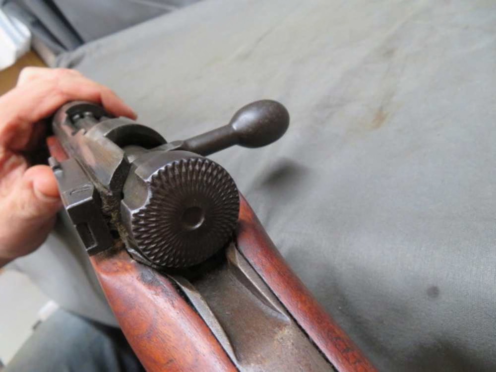 Good condition WWII Japanese Type 99 Arisaka rifle in 7.7 x 58mm caliber that was manufactured as part of the 40th Series by Jinsen Arsenal. Rifle is serial number “12”, has the rare early features seldom found on Jinsen rifles, and is documented by serial number on page 143 in the Banzai book. Mum is ground. Rifle is NOT import marked and has all matching serial numbers including receiver, bolt body, extractor, safety, and firing pin. Metal finish is original blue showing wear to brown and gray patinas. Bore is bright and excellent with strong rifling. Stock was lightly sanded and refinished. Underside of buttstock has two small faint kanji character inspector proof marks. Complete with correct original monopod, cleaning rod, and anti-aircraft rear sight wings. A rare, documented, very early Jinsen T-99 with matching numbers.