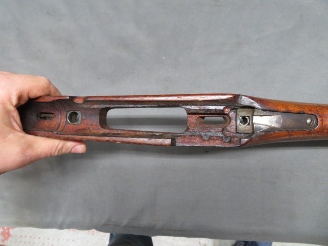 Very good condition original WWII Japanese Type 38 Arisaka carbine stock set. Full length and complete with handguard, both bands, all three band springs, nosecap, both tangs, tang screw, buttplate, and sling swivels. Wood has original finish and shows some normal handling marks. Underside of buttstock has two small kanji character inspector proof marks. Hard to find original T-38 carbine stock on the loose.