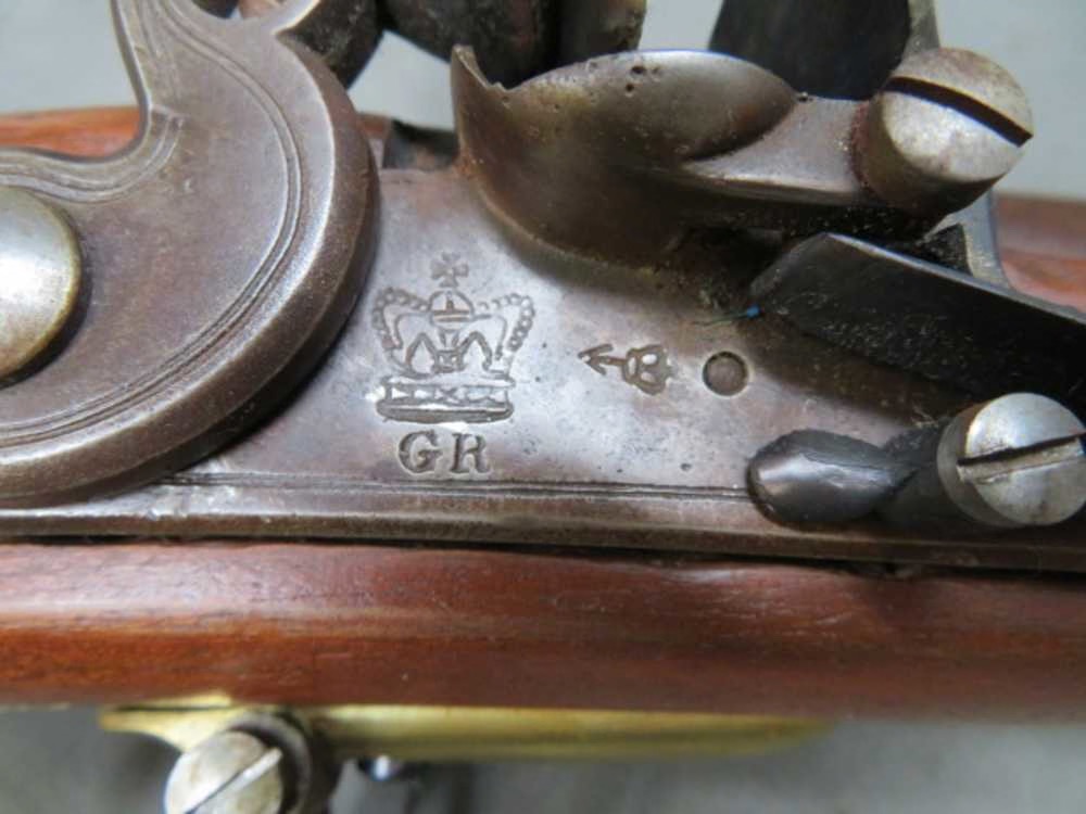 Very good condition reproduction Napoleonic era British Baker flintlock rifle musket in .63 caliber. Mechanically functions fine. Lock has the King George cypher and “TOWER” markings. Metal finish is nice looking brown. 30 ¼” barrel has original sights, but the rear sight is missing the folding leaf. Bayonet lug has been removed. Bore is bright and excellent with strong rifling. Stock has even colored finish. Left side of forend has a small crack. Complete with ramrod. A hard to find reproduction Baker rifle that will make a nice addition to a collection, a fun shooter, and work well for a reenactor.