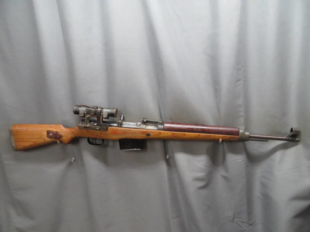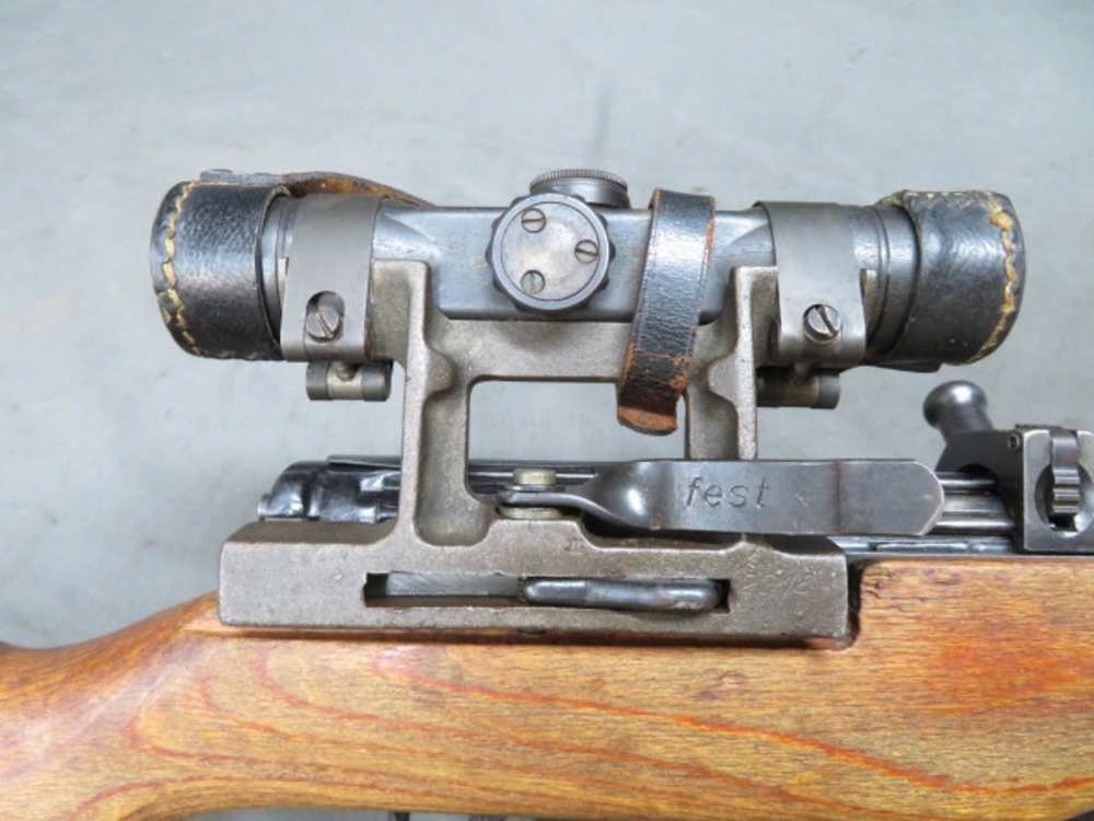 Very good condition WWII German G43 semi auto rifle in 8mm Mauser (7.92 x 57) caliber that is marked with code “ac 44” on the left side of the receiver for manufacture by Walther in 1944. Rifle is NOT import marked and has all matching serial numbers including receiver, bolt carrier, and stock. Mechanically functions fine and complete with original magazine that is marked with code “aye” for manufacture by Olympia Buromaschinenwerke. Rifle is complete with correct original Zf 4 sniper scope and mount. Scope has original blue finish showing some normal wear, and nice clear optics with original reticle. Nice markings, including code “ddx” for manufacture by Voigtlander & Sohn. Complete with original leather lens covers. Mount has nice original gray phosphate finish and is marked with an “eagle 659” and nonmatching number to the rifle. Fits gun well. Rifle has nice original gray phosphate and blue finish showing a little normal wear. Bore is very good and bright with strong rifling. Stock has original finish and shows a few normal handling marks. Underside of buttstock has a matching serial number. Left side buttstock, underside of buttstock, and underside of wrist have Waffenamts. Complete with correct original cleaning rod, front sight hood, and leather sling. A nice G43 rifle with Zf 4 scope.