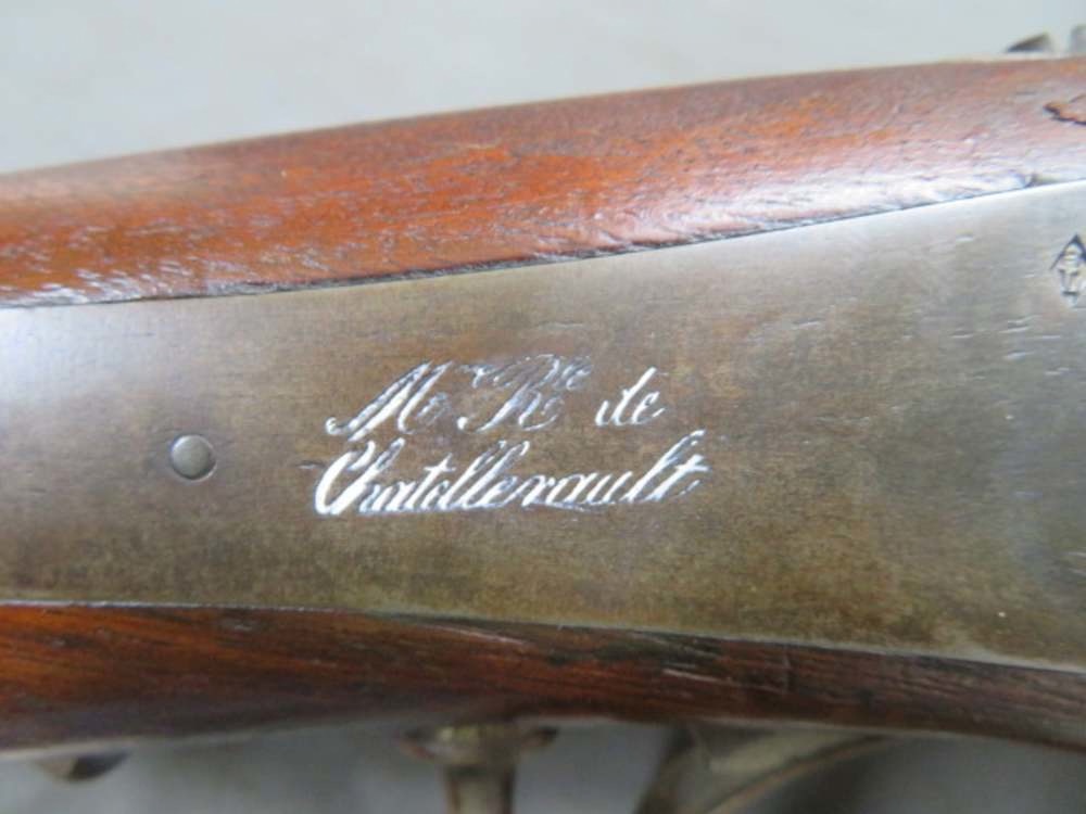 Good condition antique French Mle 1842 musket in .72 caliber. Mechanically functions fine, lock has Chatellerault Arsenal markings. Barrel is dated 1848. Gun has been shortened to “Musketoon” configuration and has a 27” barrel. Metal has mostly brown patina. Smooth bore is dark and pitted. Stock has been refinished. Right side buttstock has an inlaid brass diamond that is engraved with a name in Gothic letters. Complete with ramrod. A good wall hanger!