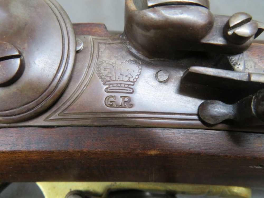 Very good condition reproduction British Pattern 1800 Baker flintlock rifle musket in .62 caliber. Mechanically functions fine. Lock is marked “TOWER” with the King George cypher. Metal finish is nice looking brown. 30 5/8” barrel has original sights and bayonet lug. Smooth bore is bright and excellent. Stock has nice looking finish and shows a few normal handling marks. Complete with ramrod. A hard to find reproduction Baker musket that will make a fine addition to a collection, a great shooter, and work well for a reenactor.