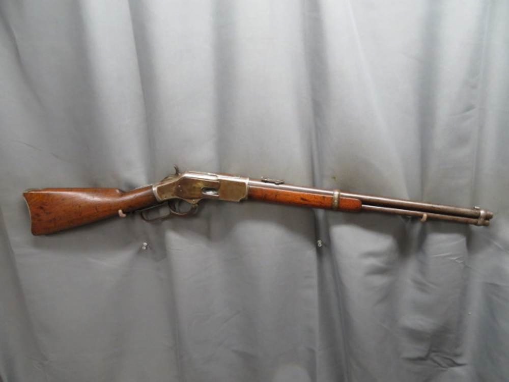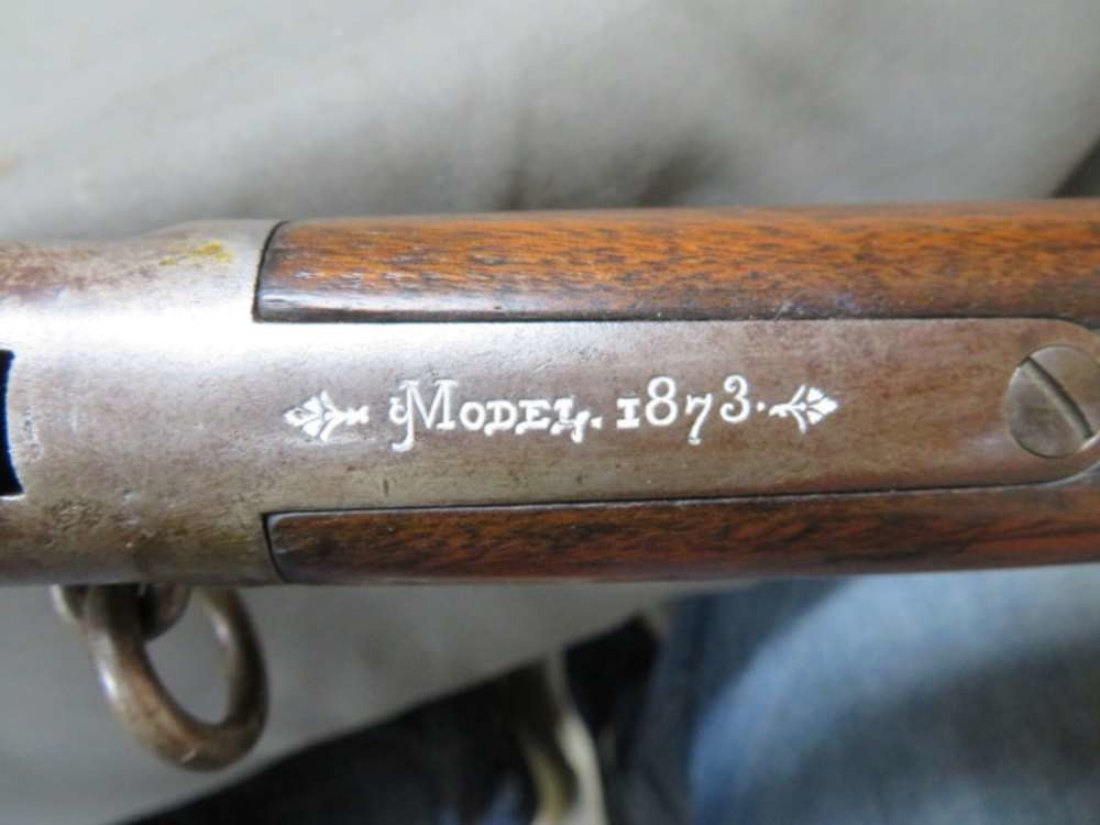 Good condition antique Winchester Model 1873 lever action saddle ring carbine in .44-40 caliber that is serial number 123xxx, which dates it to manufacture in 1883. Mechanically functions fine. Metal finish is original blue mostly worn to brown and gray patina. 20” round barrel has original sights. Bore is gray with average rifling and some pitting. Stock has original finish and shows some normal handling marks. A good honest antique Winchester 1873 carbine that will make a fine addition to a collection.