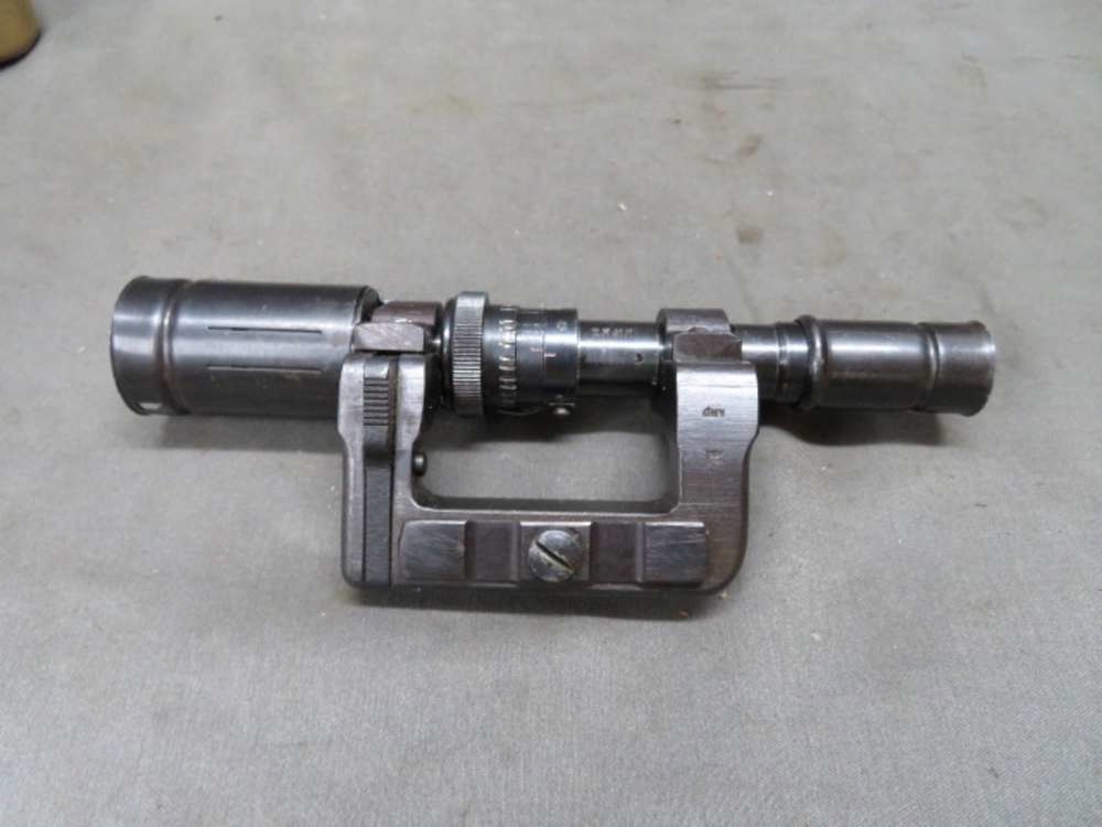 Very good condition original WWII German Zf 41 sniper scope for the 98k Mauser Rifle. Scope has nice original blue finish. Marked with code “cxn” for manufacture by Emil Busch. Optics are hazy. Original reticle is present. Scope is complete with both eye shades. Mount has nice original blue finish and has a working latch. Marked with code “duv” for Berlin Lubecker. Comes with original can that has nice original paint. Marked with code “jvb” and a Waffenamt. Case is complete. Nice Zf 41 scope.
