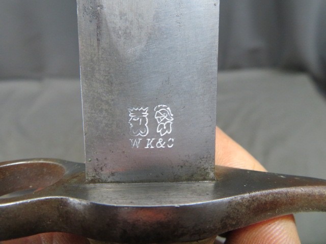 Very good condition original pre WWI Imperial German Model 1871 Mauser bayonet. This is an unusual commercial variation, possibly for cadet use, but still fits the M1871 Mauser and GEW 88 Commission Rifles. Bayonet is maker marked “WK&C” on the right ricasso. 18 ¼” blade has original bright finish with a little scattered graying. Guard has original bright finish with some brown patina. Brass handle has nice mellow patina. Lock button and leaf spring function fine. Fitted in correct original leather scabbard that has brass throat and tip. Leather is soft and supple with some normal wear, stitching and staples are tight. Also complete with original leather frog. Leather is soft and supple with some normal wear and crazing, stitching and rivets are tight. Hard to find bayonet that will make a fine addition to a collection.