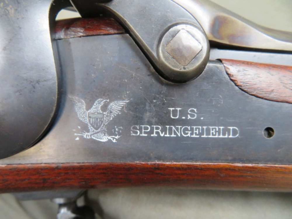 Excellent condition antique US Model 1884 Trapdoor Springfield Rifle in .45-70 caliber. Lock is marked “U.S. / SPRINGFIELD” with the American eagle. Breech block is marked “MODEL 1884”. Barrel has “VP” and eagle head proof marks. Metal finish is excellent original blue. Breech block and breech tang retain vivid original case colors. Bore is bright and excellent with strong rifling. Stock has beautiful original finish and crisp edges with a few normal handling marks. Left side of wrist has a sharp clear 1889 dated “SWP” inspector cartouche. Underside of wrist has a sharp clear “circle P” cartouche. Complete with correct original cleaning rod. A beautiful US Model 1884 Trapdoor Springfield Rifle, tough to find in this condition!