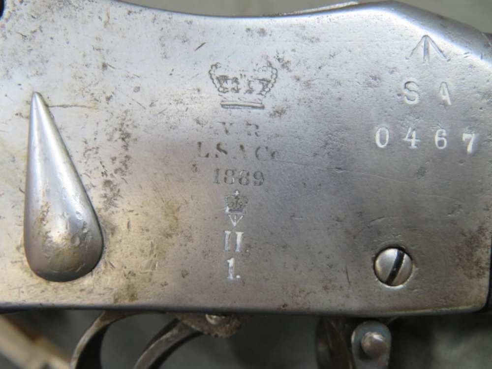 Good condition antique British Mark II Martini Henry Rifle in .577-450 caliber that was manufactured by L.S.A.Co. (London Small Arms Company) in 1889, as marked on the right side of the receiver. Mechanically functions fine. Right side of receiver is marked “Broad Arrow / SA”, indicating South African use. Rifle is an Afghanistan vet bringback and comes with original affidavit paper allowing him to bring it home. Metal is worn to the white with some gray and brown patina. Bore is dark with good rifling. Stock has original finish and shows some wear and handling marks. Top of wrist has some chips. Both sides of wrist have a hairline. Complete with cleaning rod. A nice classic Martini Henry rifle that will make a great addition to a collection!