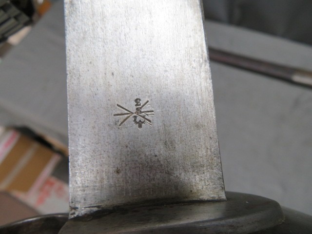Good condition original Civil War British Pattern 1859 Naval Cutlass Bayonet, as issued with the Pattern 1858 Enfield Navy Rifle. Bayonet was manufactured by WKC in Germany and has the “knight head” trademark on the left ricasso. Right ricasso has a British proof mark and “dual Broad Arrows” indicating it was sold out of British service. 26 ¾” blade has original bright finish with some gray patches of pitting. Hilt has brown and gray patina with some light pitting. Checkered leather grips show some normal wear. Lock button and leaf spring function fine. Fitted in correct original leather scabbard that has steel throat and tip. Leather is somewhat dry and shows some wear and flaking. Stitching and staples are tight. A rare original British P-1859 Naval cutlass bayonet that will make a fine addition to a collection.