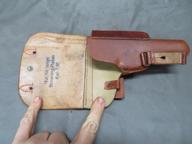 Very good condition original WWII German Luftwaffe holster for the Belgian FN Browning Model 1922 pistol. Has a sharp clear Heinrich Krieghoff trademark on the belt loop and a “Luftamt 2” proof mark on the flap. Nice ink stamped model designation under the flap. “Ersatz” type with laminated paper body and leather flap, magazine pocket, and belt loop. Holster shows light wear overall. Leather is soft and supple. Stitching and rivets are tight. Rare and desirable Krieghoff 1922 Browning holster.