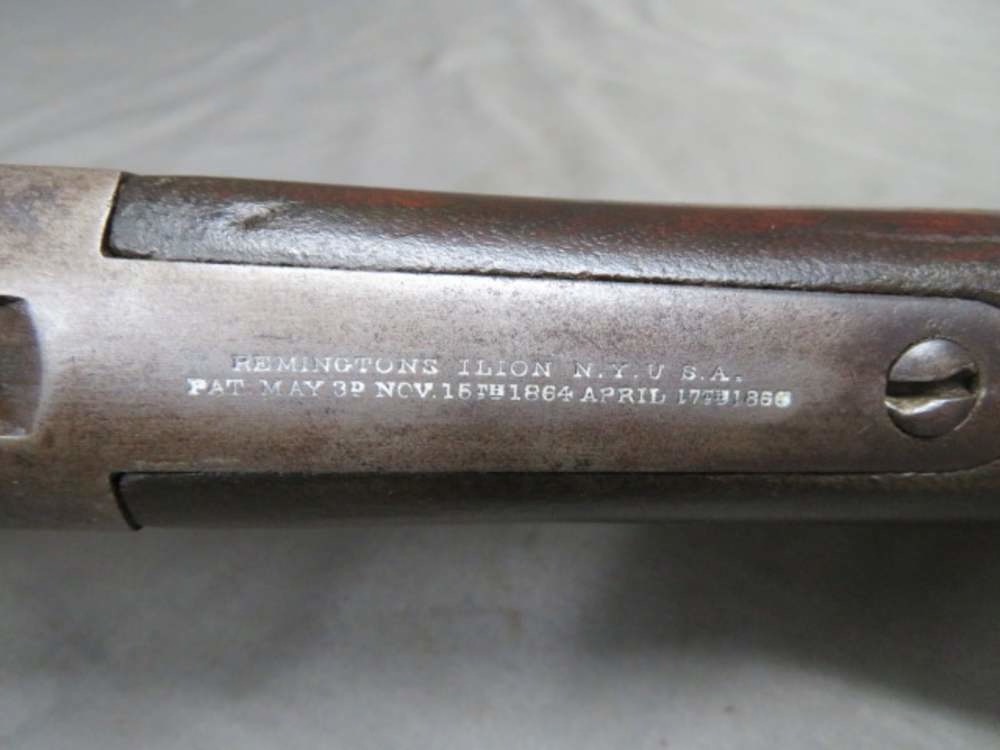 Good condition antique Remington Rolling Block “transformed” rifle in .58 Berdan centerfire caliber. Produced in the late 1860’s-early 1870’s using repurposed Civil War US Model 1861/1863 Springfield Rifle-Musket barrels. South Carolina and Texas purchased these “transformed” rifles, but this rifle bears neither state’s markings. The “US” marking on the buttplate tang has been peened. Mechanically functions fine and tight. Receiver tang has the Remington two-line address. Receiver ring has an added sighting groove. Rifle has a correct Springfield Rifle-Musket style rear sight that may be a replacement and has a poor fit. Original front sight is present. Metal finish is original “in the white”, mostly taken on brown and gray patina. 39” barrel has a good bore with strong rifling and some pitting. Stock was refinished and shows some handling marks. Right side of forend has a chip by the receiver. Complete with cleaning rod. A hard to find Remington Rolling Block variation that will make a fine addition toa  collection.