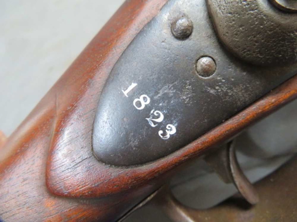 Good condition original antique US Model 1816 musket. Originally made as a .69 caliber smoothbore and later converted to .58 caliber percussion, with the bore rifled. Has the “chambered breech” conversion. Originally manufactured by Brooke Evans of Philadelphia and is marked “B. EVANS VALLEY FORGE” on the lock and dated 1823. Mechanically functions fine. Metal has mostly plum brown patina. 41 ½” barrel has a Model 1861 style rear sight. Front sight blade was added to the front band. Bore is very good and bright with strong six-groove rifling. Stock has been sanded and refinished and has even color. Buttstock edges have been reshaped. Complete with ramrod. An interesting American military rifled musket that warrants further research!